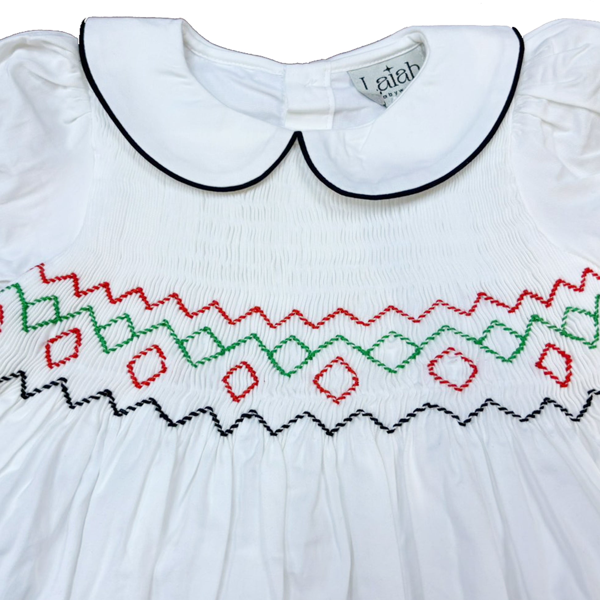 Elegant white cotton meets hand-smocked embroidery in the colors of the flag — red, green, black, and white — celebrating Emirati Pride with timeless grace. The Peter Pan collar and piped sleeves add a classic touch, making it the perfect piece for National Day festivities and proud family moments. Comes with matching hair clips.