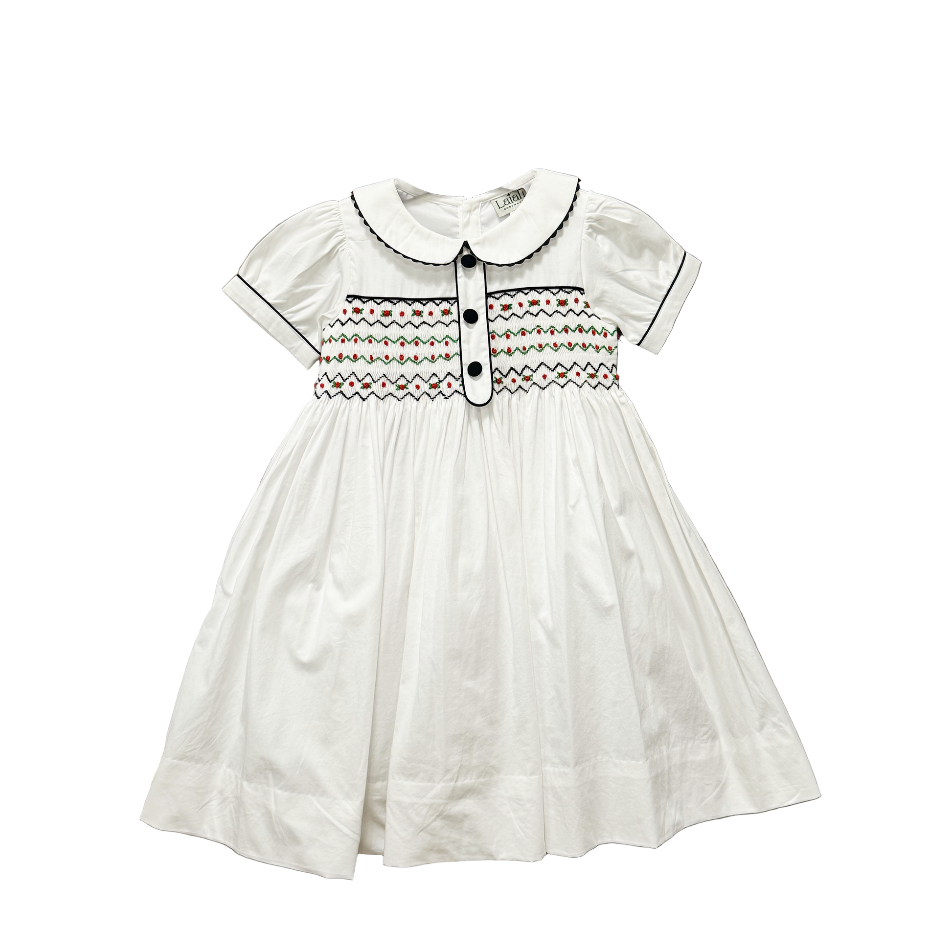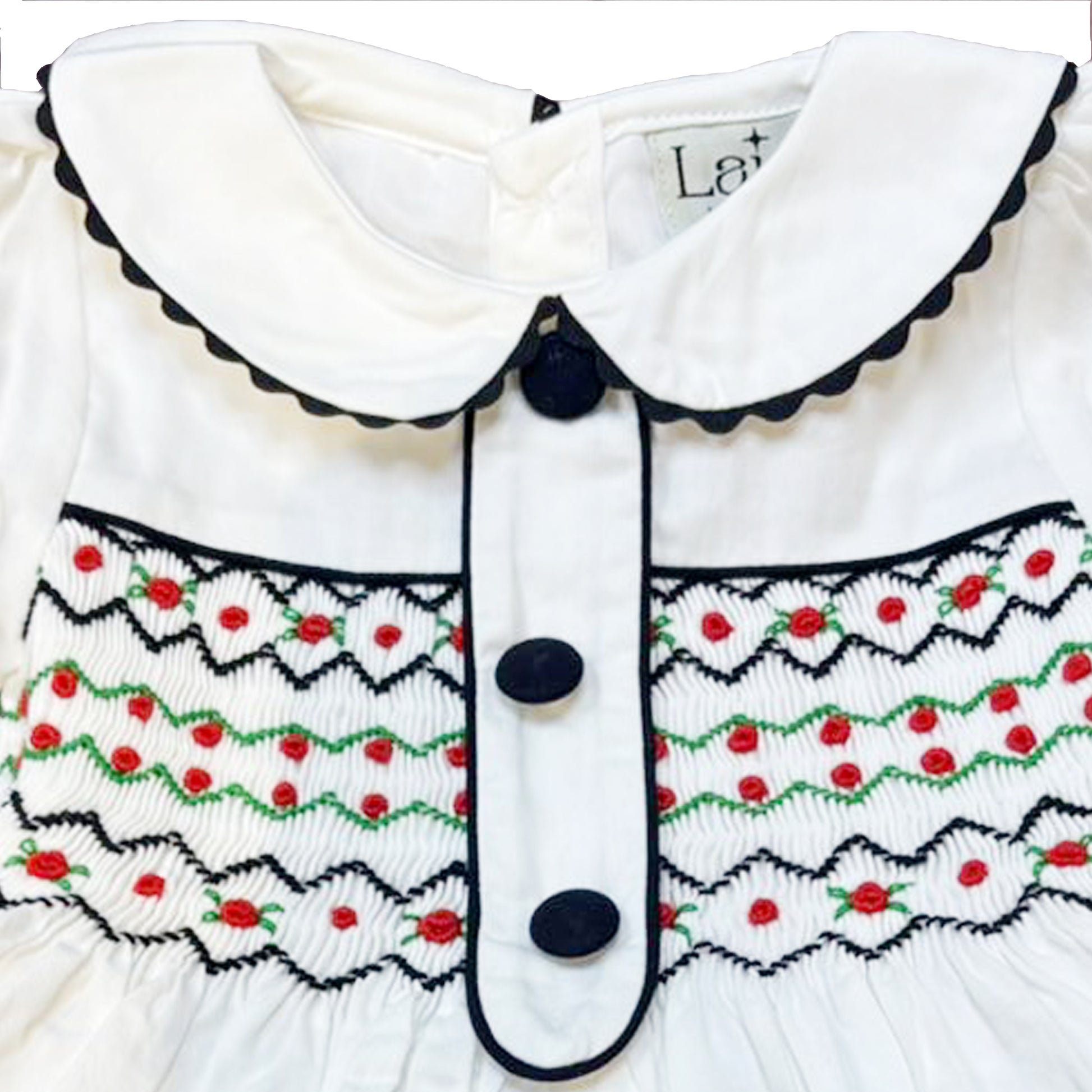 Elegant white cotton meets hand-smocked embroidery in the colors of the flag — red, green, black, and white — celebrating Emirati Pride with timeless grace. The Peter Pan collar and piped sleeves add a classic touch with elegant floral embroidery and black buttons for the final touch, making it the perfect piece for National Day festivities and proud family moments. Comes with matching hair clips.