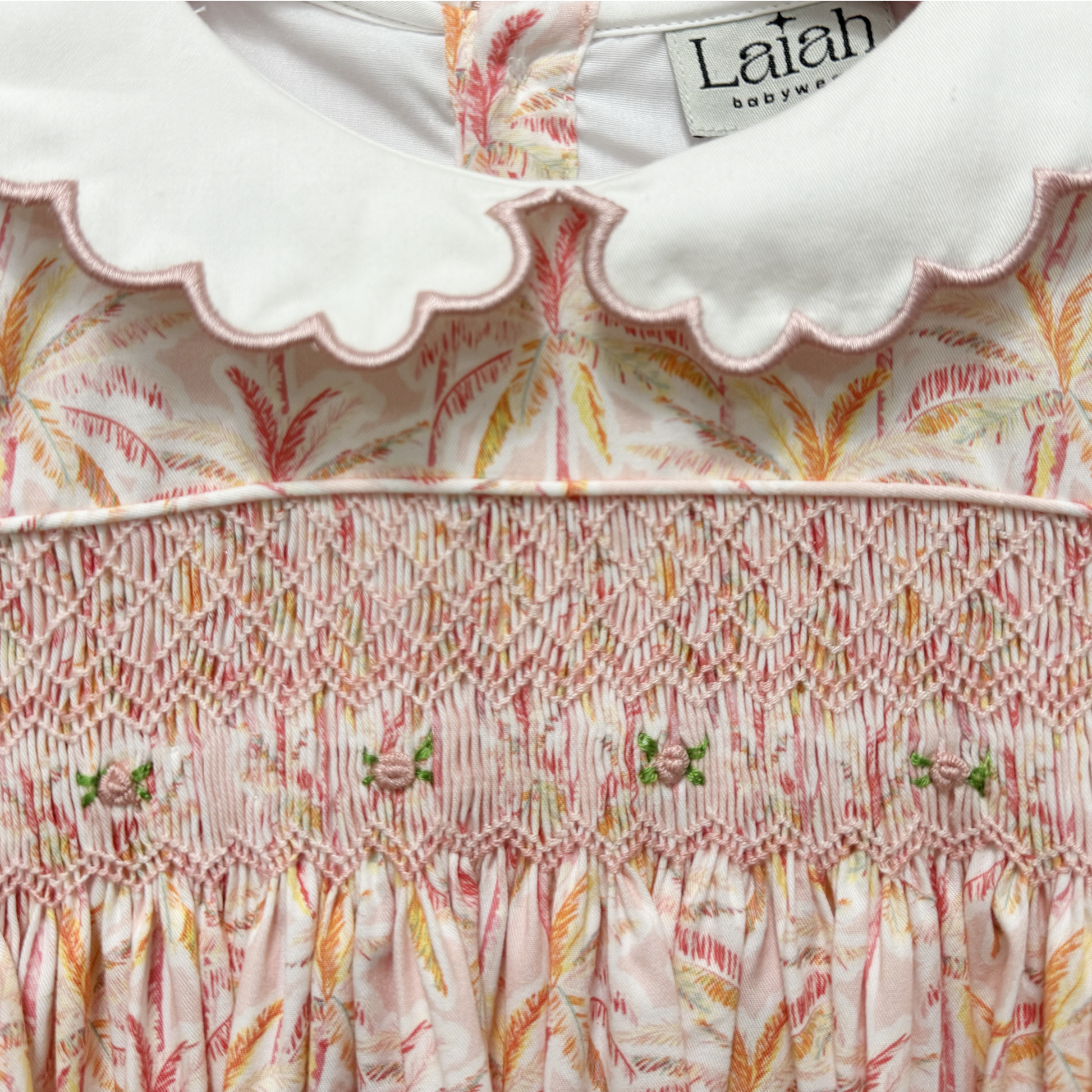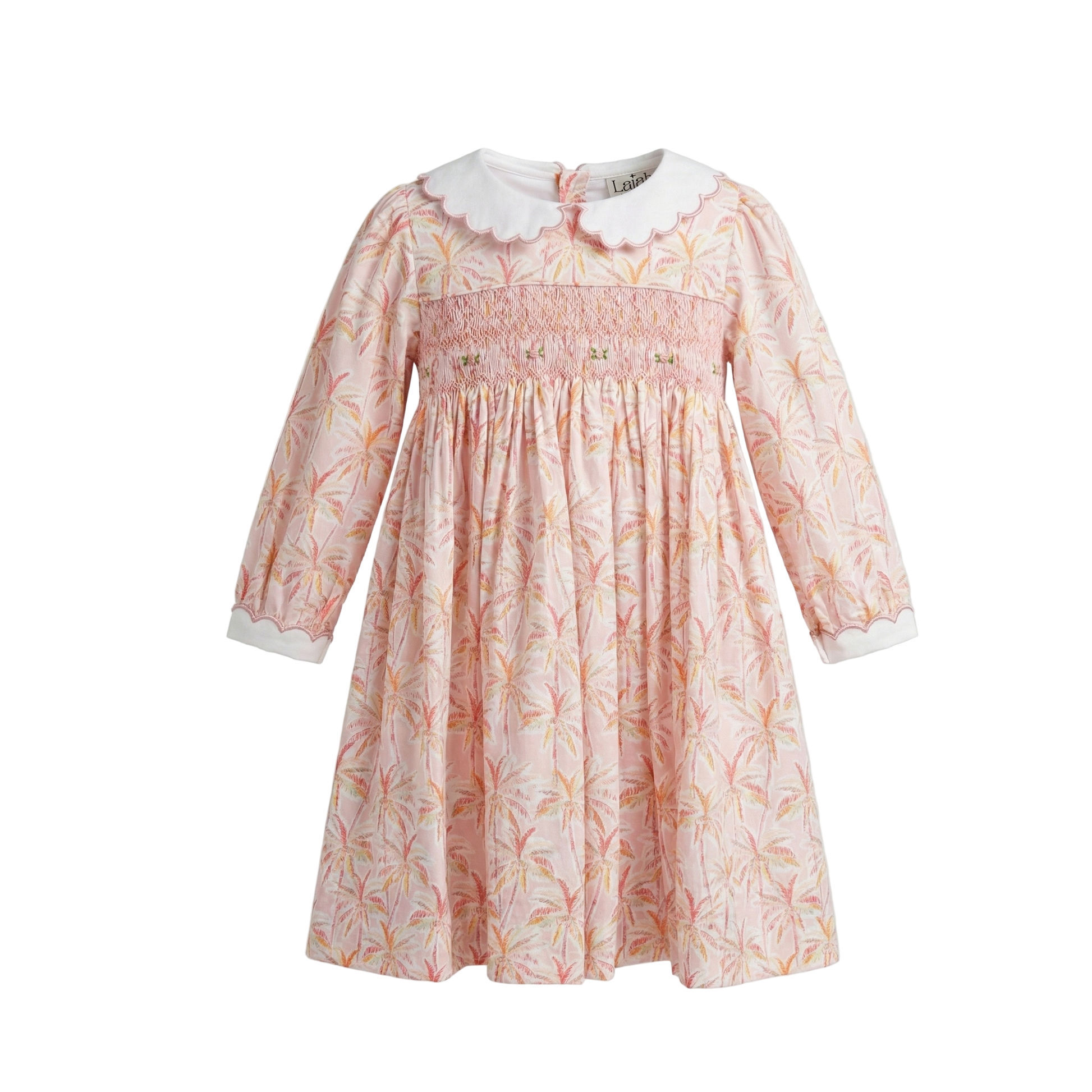 This long-sleeved smocked dress features a delicate palm print in warm shades of blush, peach, and gold. Hand-embroidered details across the chest add an artisanal touch, while the scalloped white collar and cuffs bring a classic Laiah finish. Made from breathable cotton and fully lined for comfort, it’s the perfect balance of charm and sophistication — ideal for cooler days, special gatherings, or family occasions.