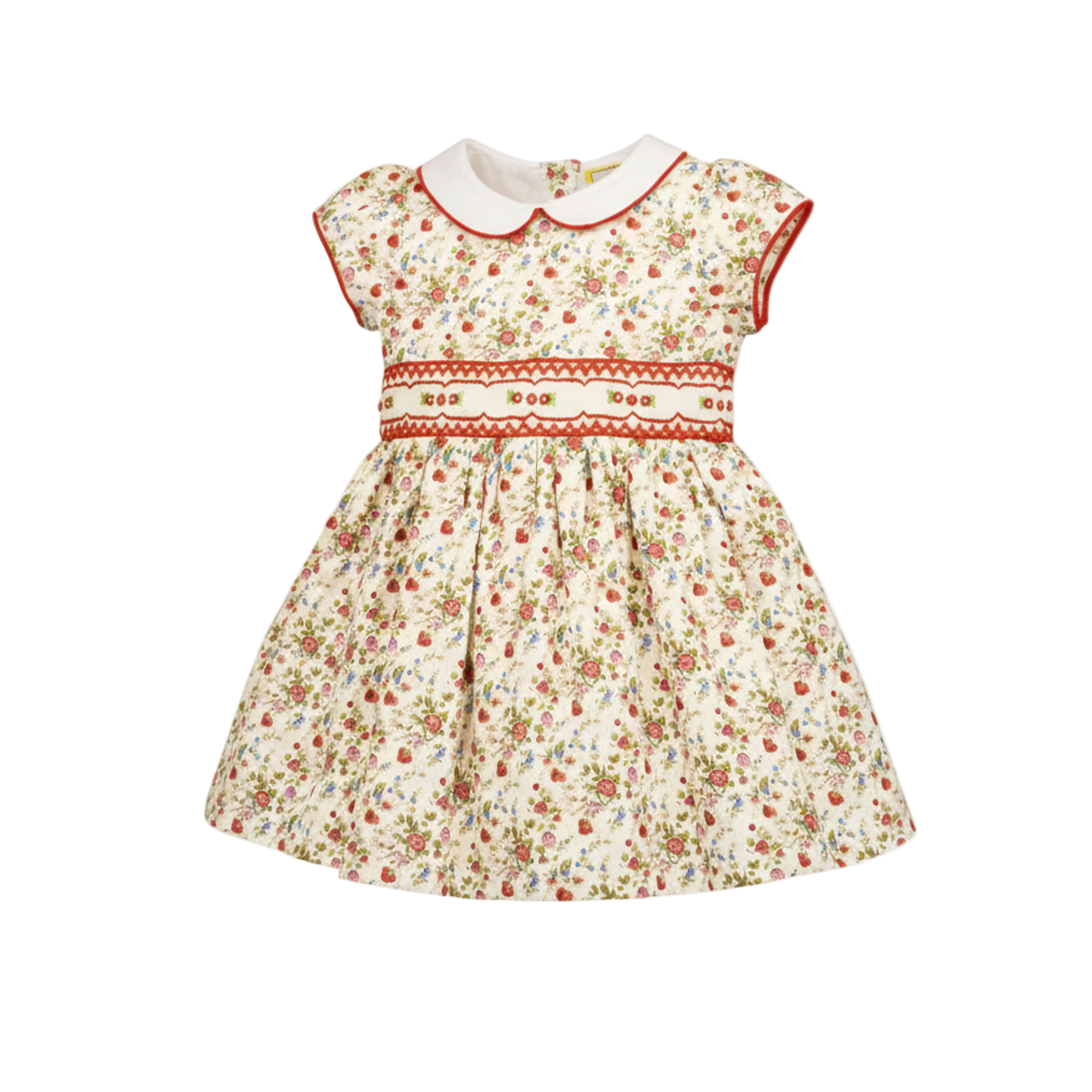 Featuring a soft floral print and hand-embroidered smock detail in warm red tones, this dress brings cheerful charm to your little one’s wardrobe. The Peter Pan collar and capped sleeves complete a look that’s perfect for playdates or family gatherings. Comes with matching hair clips.