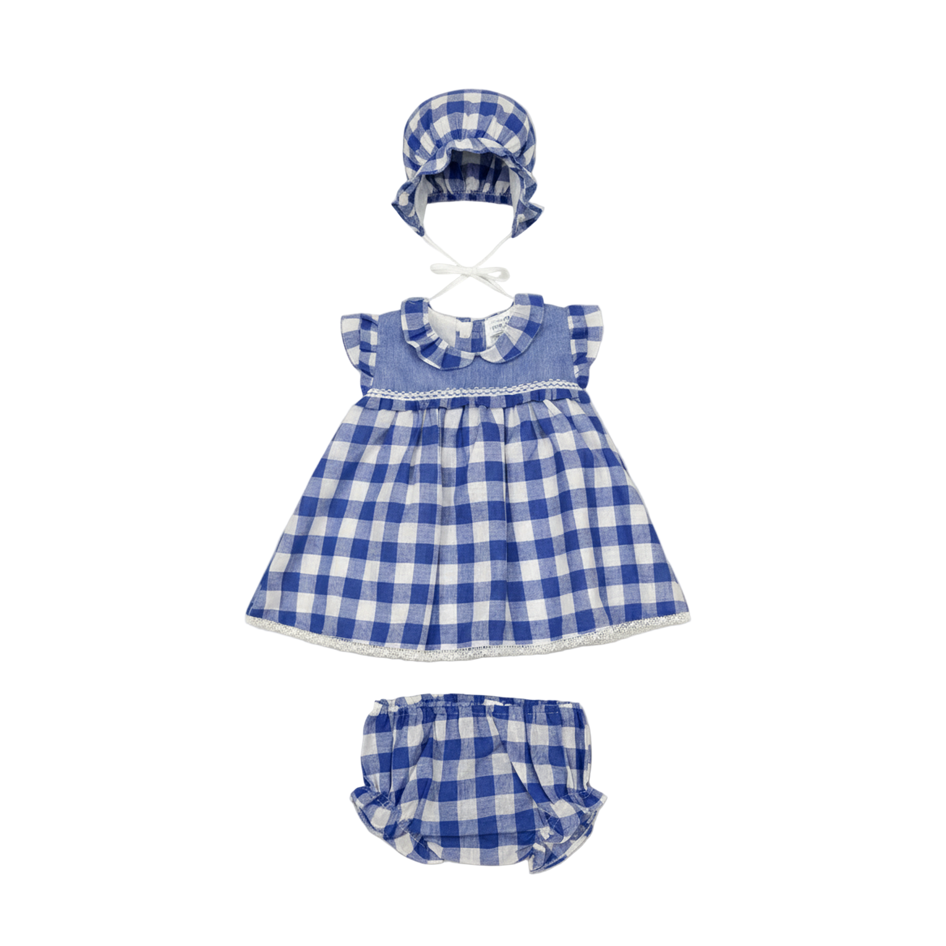 This three-piece gingham ensemble includes a smocked dress, matching bloomers, and a bonnet, crafted for comfort and style. Lace trims and delicate pleats make it an heirloom-worthy piece for your little one.